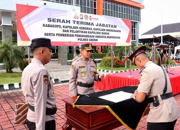 GRESIK – Kapolres Gresik, AKBP Rovan Richard Mahenu, memimpin upacara serah terima jabatan (Sertijab) pejabat utama (PJU) dan Kapolsek jajaran di lapangan Mapolres Gresik. Upacara ini dihadiri oleh seluruh jajaran pejabat utama, Kapolsek, serta personel Polres Gresik. Senin(24-02-2025)